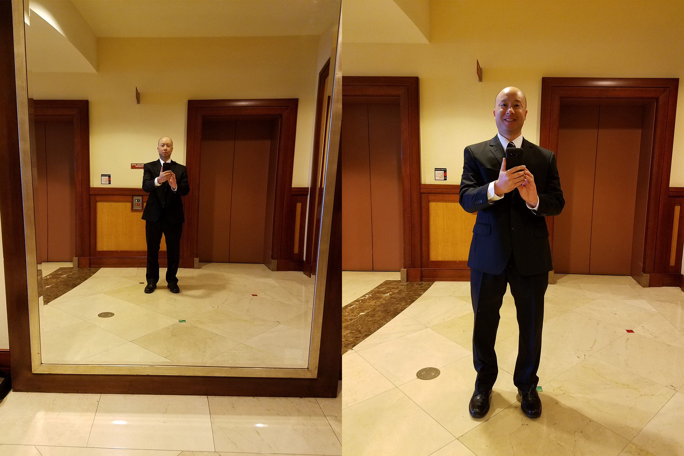 My Mom's Cousin WeddingMy Mom's cousin son was married on Jun 3, 2017. The service and dinner took place at the Marriott Hotel in San Mateo, CA. Here is a dual picture of myself two months after my surgeries. The left side one can see how big the mirror in front of the hotel lobby. The right side is a close up. I lost eight pounds one month before my surgeries. I lost an additional 12 pounds after my surgeries.  |